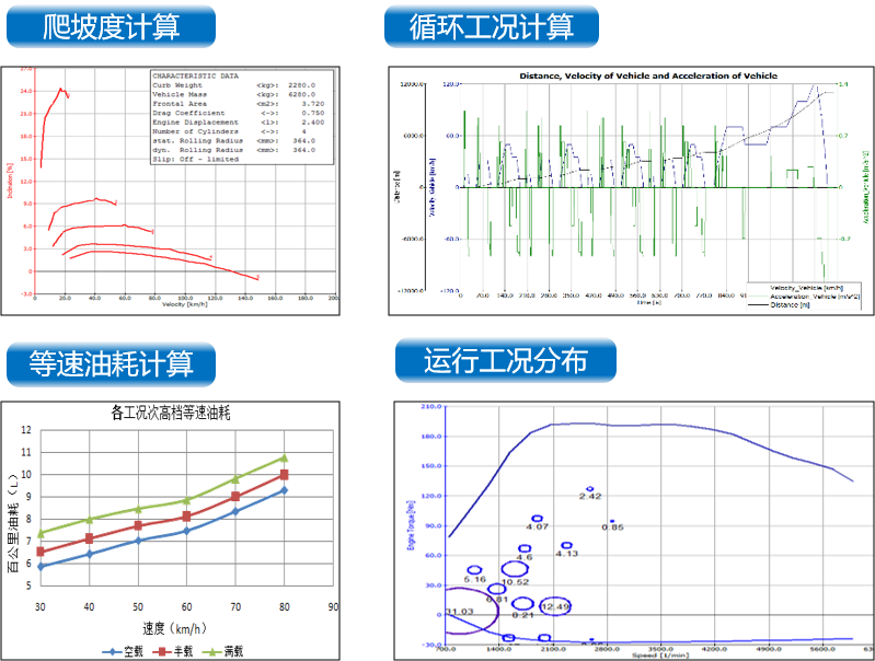 经过标定的模型可用于最大爬坡度计算、最高车速计算、循环油耗预测、等速油耗预测、发动机选型匹配、变速箱速比优化、主减速比优化。